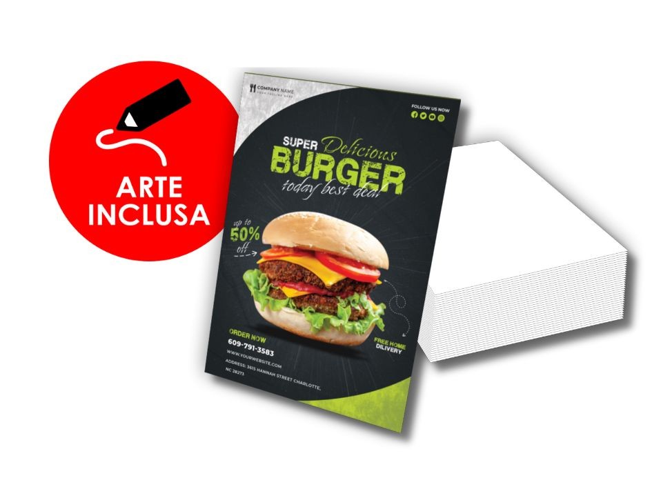 É um material gráfico impresso em um papel de alta qualidade, com o tamanho de 10 centímetros de largura por 14 centímetros de altura. A impressão é feita apenas em um lado do papel, o que permite uma grande área para a sua comunicação visual.