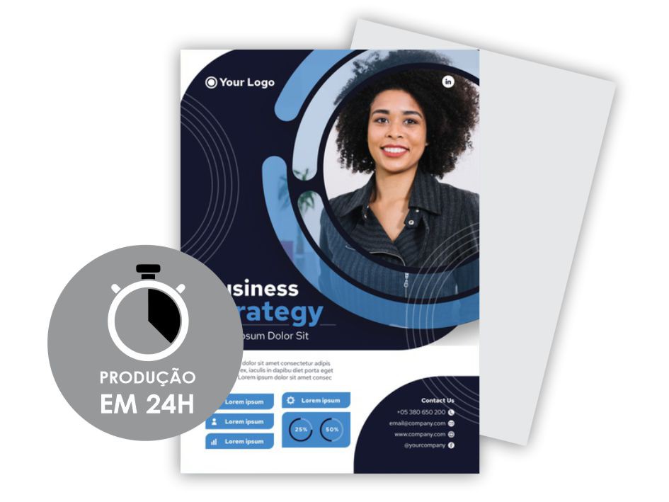É um material gráfico impresso em um papel de alta qualidade, com o tamanho de 7 centímetros de largura por 10 centímetros de altura. A impressão é feita apenas em um lado do papel, o que permite uma grande área para a sua comunicação visual.